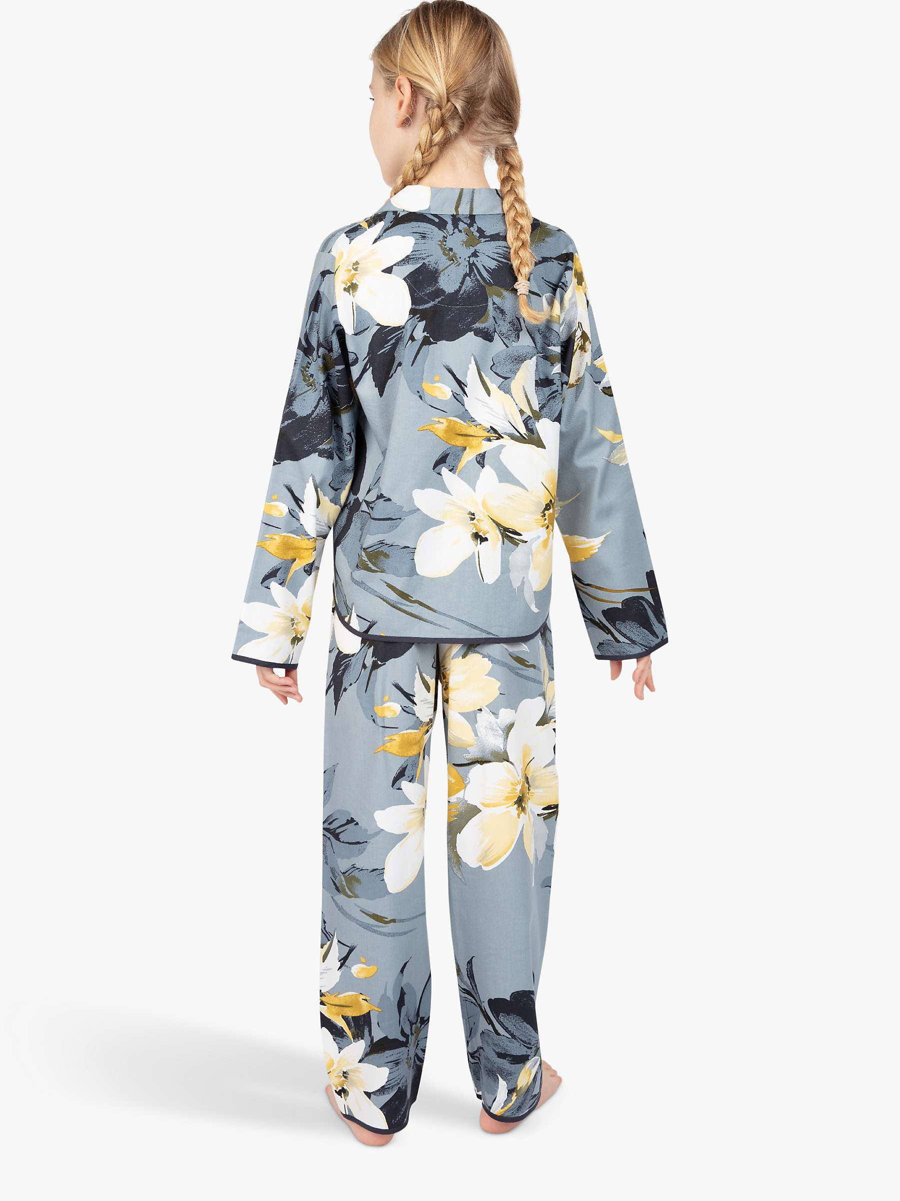 A stunning combination of grey and ochre in a gorgeous oversized floral print give these girls pyjamas a beautiful bedtime style. Made from super-soft 60% cotton, 40% modal, the set is trimmed with charcoal modal. The long-sleeved top has an open collar and fastens at the front with charcoal buttons. The waist is fully elasticated with an adjustable front drawstring. These pyjamas coordinate with our women's collection to create that 'mini-me' look.